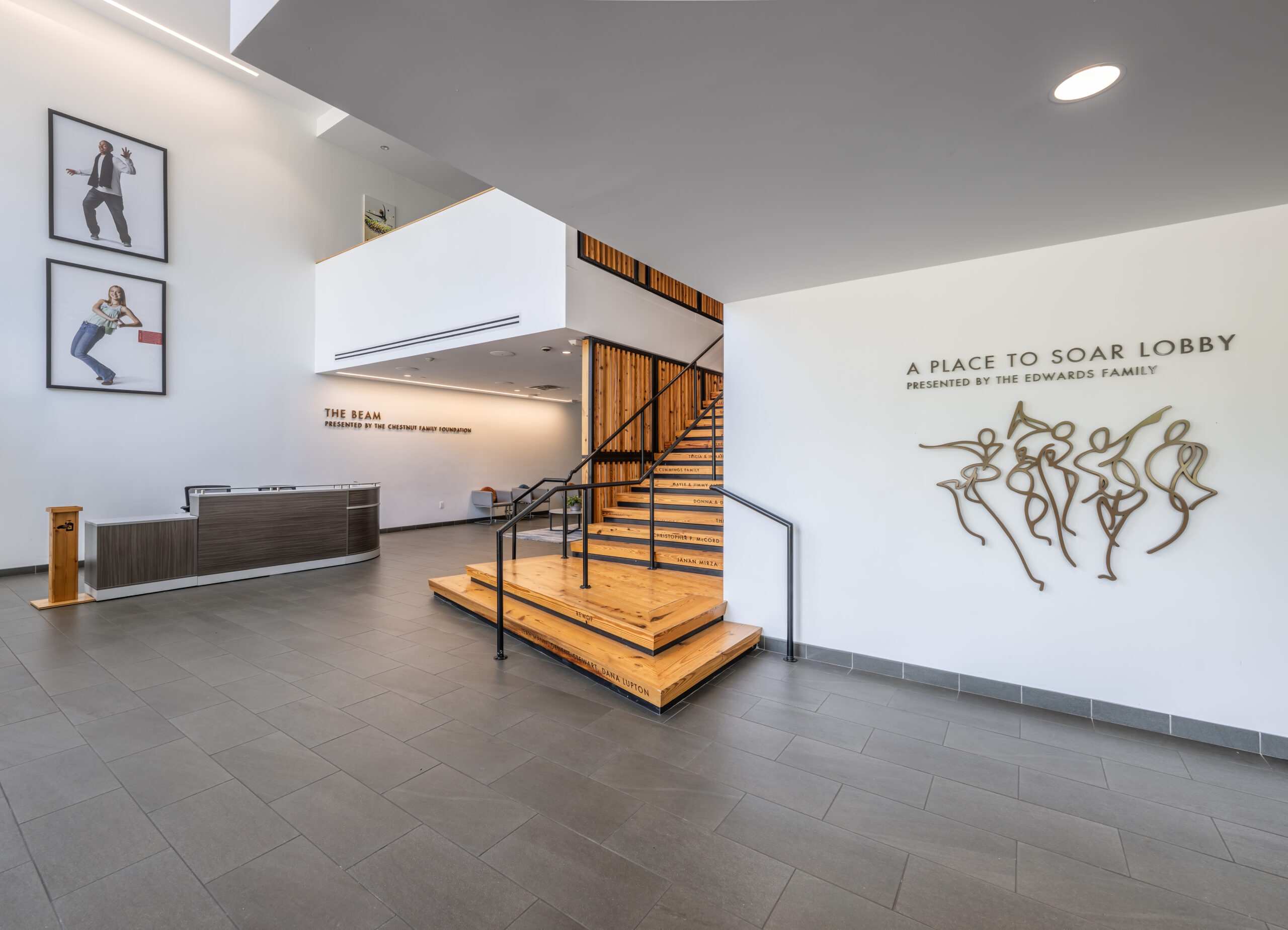 Our modern lobby features a beautiful, open space with floor-to-ceiling windows, several small seating areas, and stunning natural light. This area can accommodate 175 guests. A warming kitchen for catering services is provided with this rental.