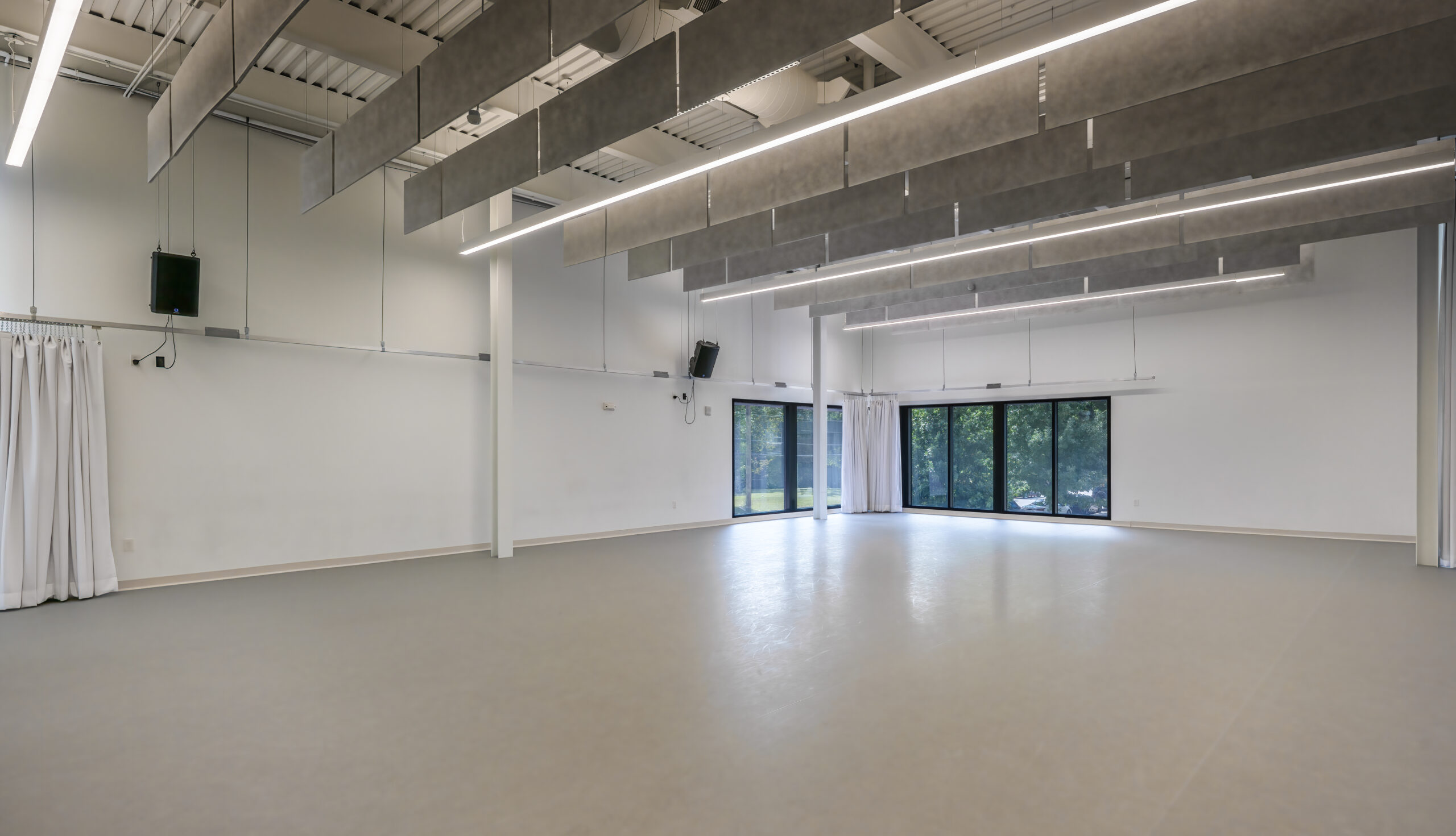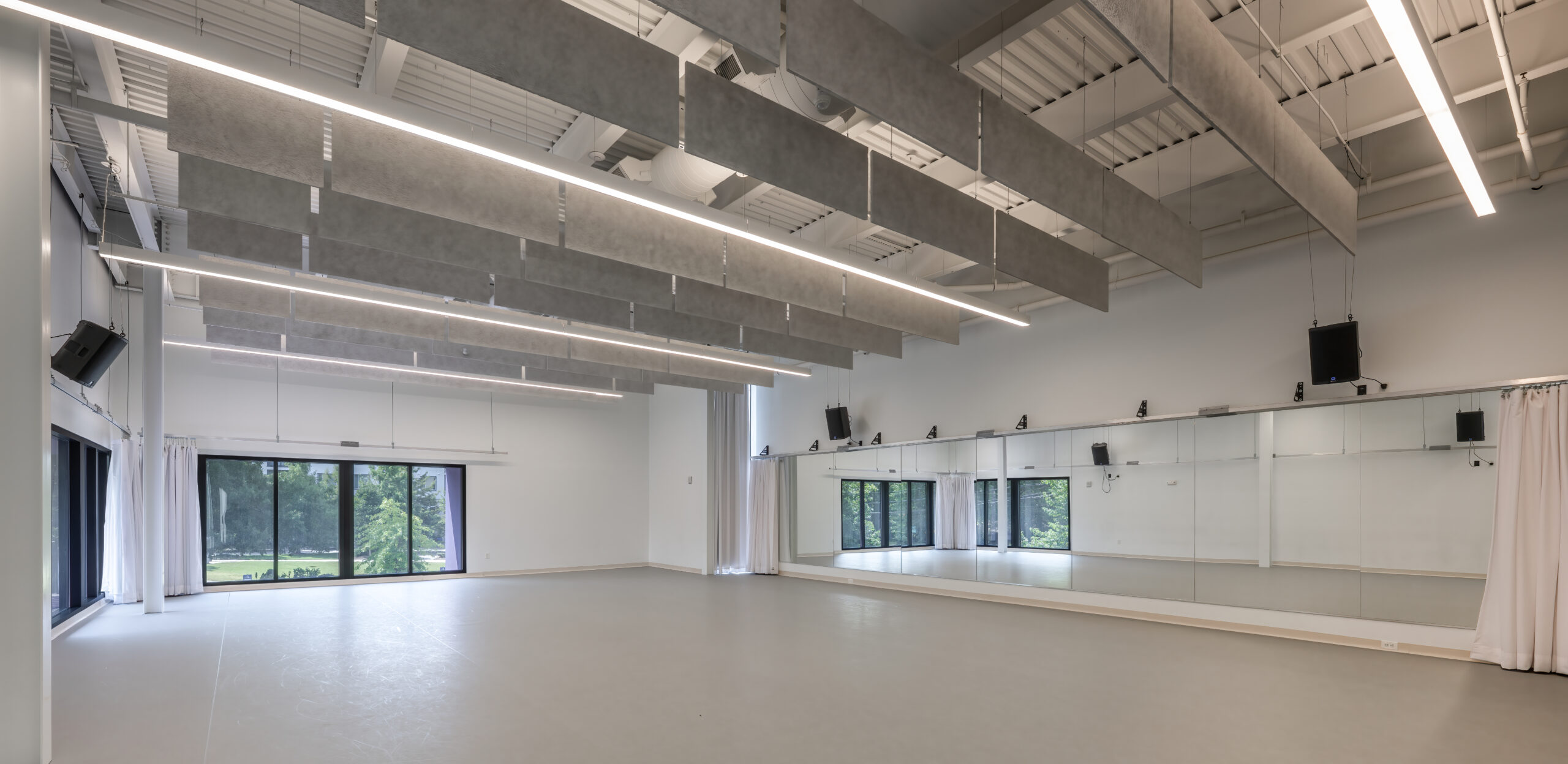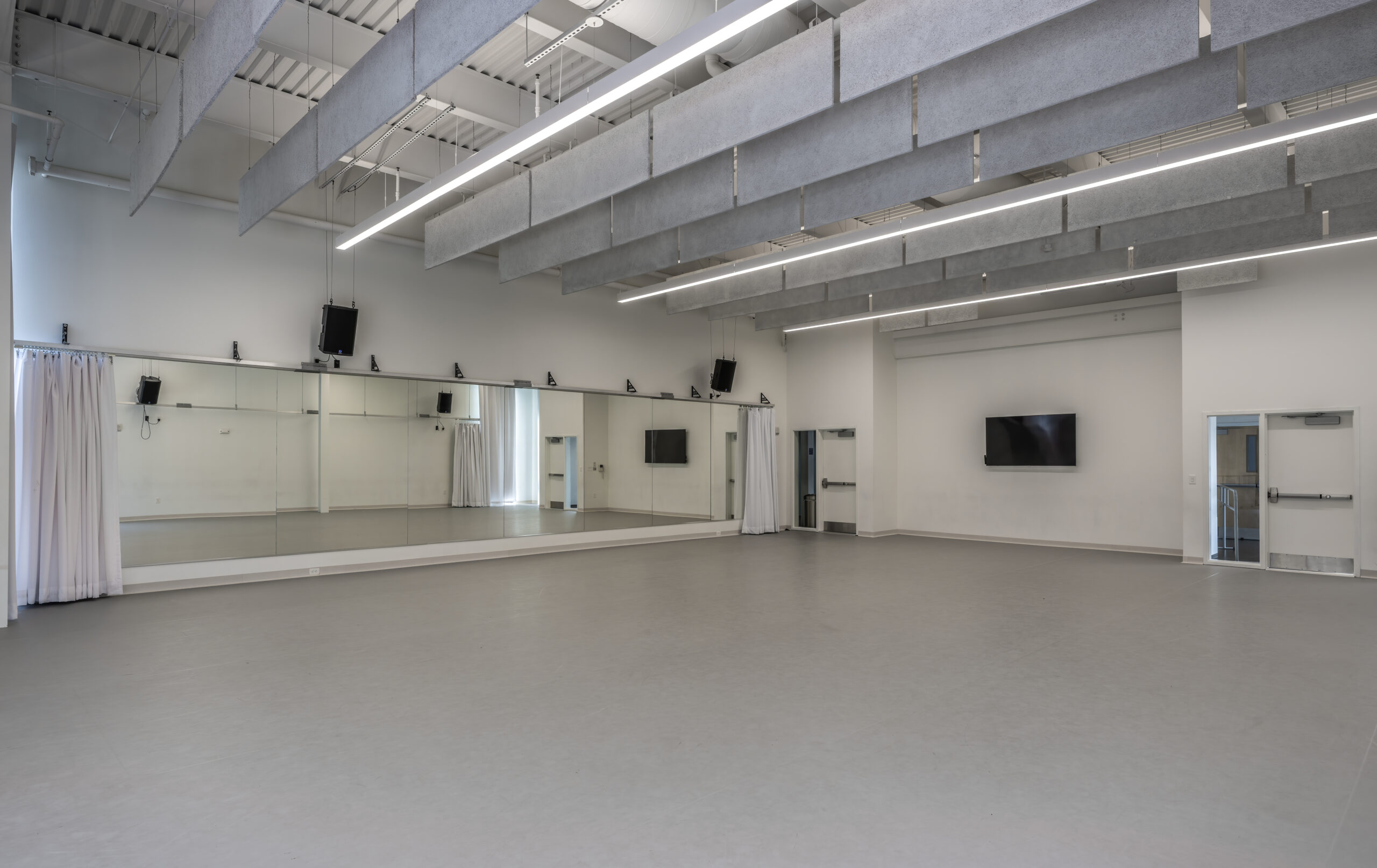 Our two large studios, each measuring 50'x37', feature top-of-the-line Harlequin sprung floors to protect dancers' muscles and joints. Each studio features a full mirror wall, large windows, and Bluetooth stereo systems. Capacity is 75 people per studio.